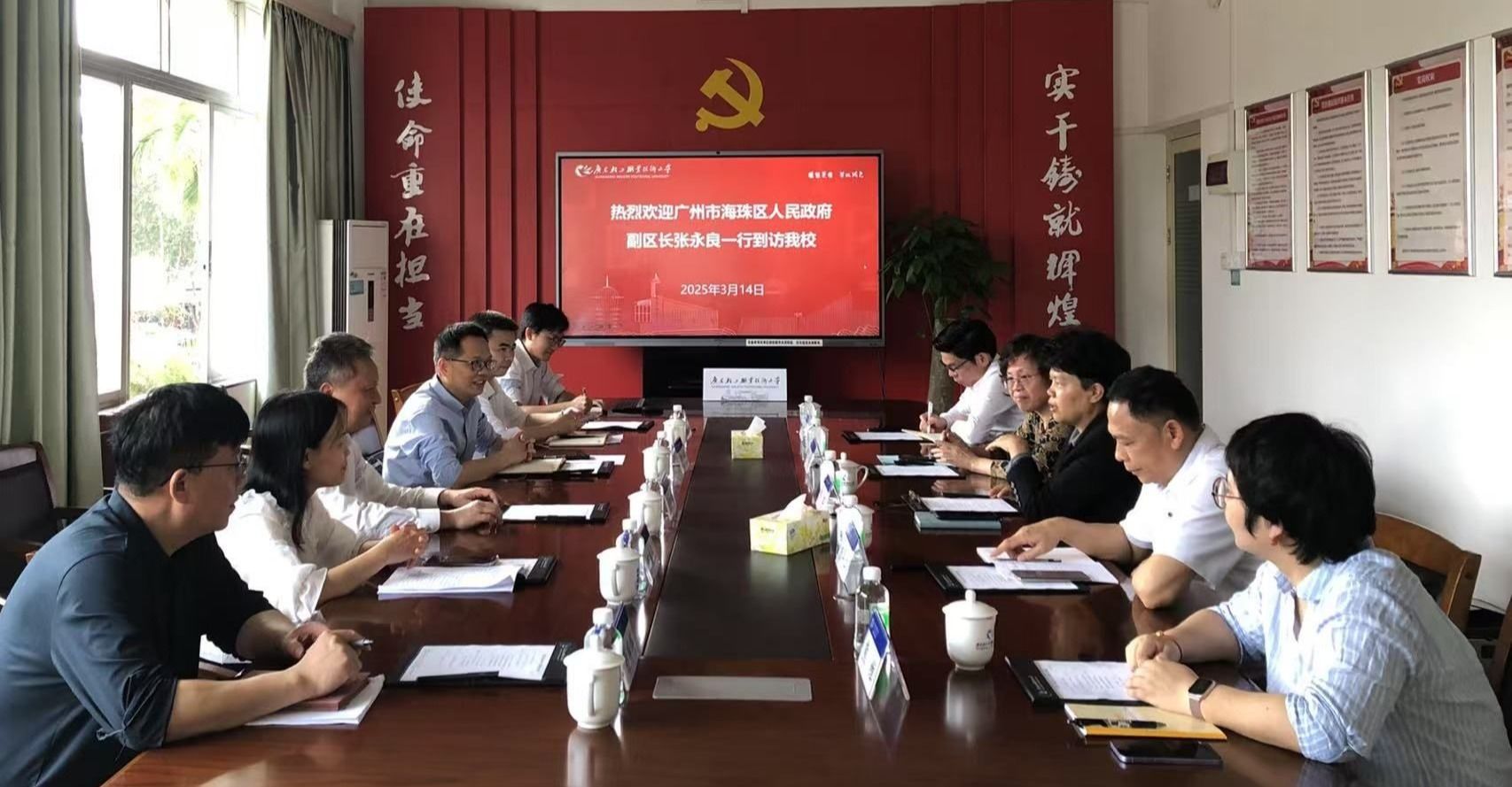 3月14日,广州市海珠区人民政府副区长张永良一行5人到成人電影调研。学校副校长李荣在新港校区办公楼二楼会议室接待了来访客人。座谈会上,李荣对张永良一行的到访表示热烈欢迎,并简要介绍了学校在校区建设、人才引进、后勤保障等方面的最新情况。随后,双方围绕增强沟通交流、促进校地双方协同发展等事…