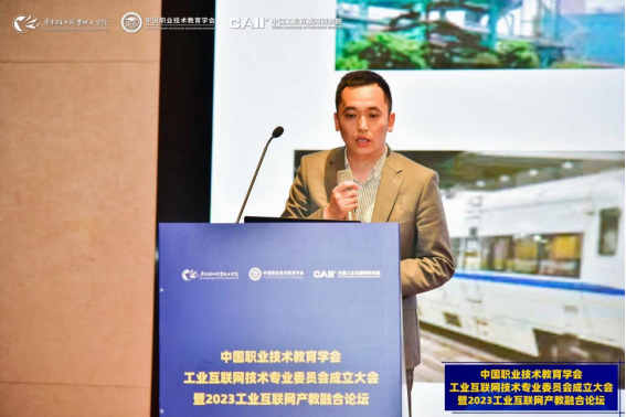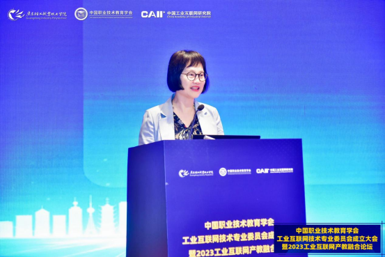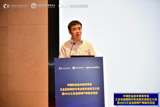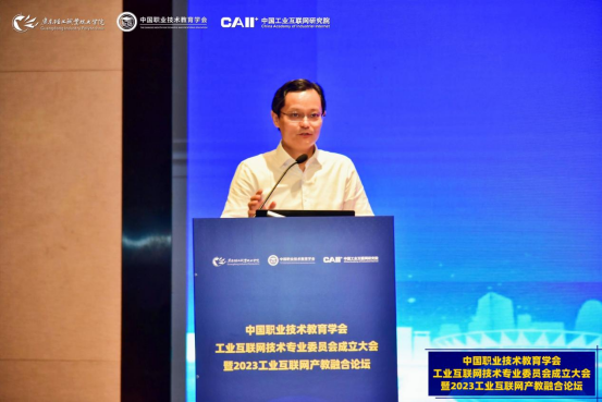 教育部职成教司综合改革处二级调研员李红东线上出席会议并致辞,他表示,中国职教学会主动适应产业发展需求和人才培养需要,组建工业互联网技术专业委员会,积极探索工业互联网领域的产教融合、科教融汇,促进教育链人才链与产业链、创新链的有机衔接,体现了中国职教学会高度的时代自觉和责任担当,并对工业互联网技术专委会建设提出指导性要求和建议。
