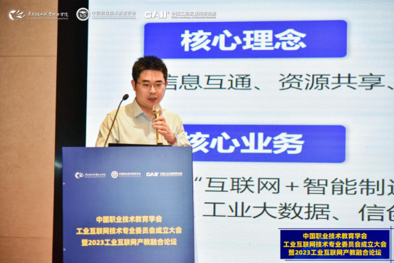 新道科技股份有限公司副总裁耿兆强做了题为《工业互联网助力企业数智化转型于数智化人才培养》的主题报告。报告站在产业的角度,特别是用友在服务于700万家企业的实践过程中探索出来的工业互联网赋能产业的工业互联网模型,并对专业和课程建设提出了一些思考。