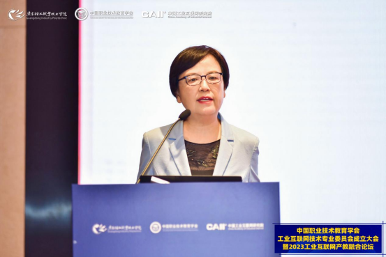 广东省教育厅二级巡视员吴艳玲致辞,她指出,中国职业教育学会工业互联网技术专委会设在广东轻工职业技术学院,为广东职业教育高质量发展增值赋能,对广东的职业教育发展注入了更强劲的驱动力。工业互联网是实体经济数字化转型升级的关键。广东积极推进制造业数字化转型升级,以数字化赋能制造业产业转型升级。广东轻工职业技术学院要协同广东职业教育学会,认真地推进好中国职业技术教育学会交办的各项工作,认真做好工业互联网专委会的各项工作,争取取得丰硕成果。