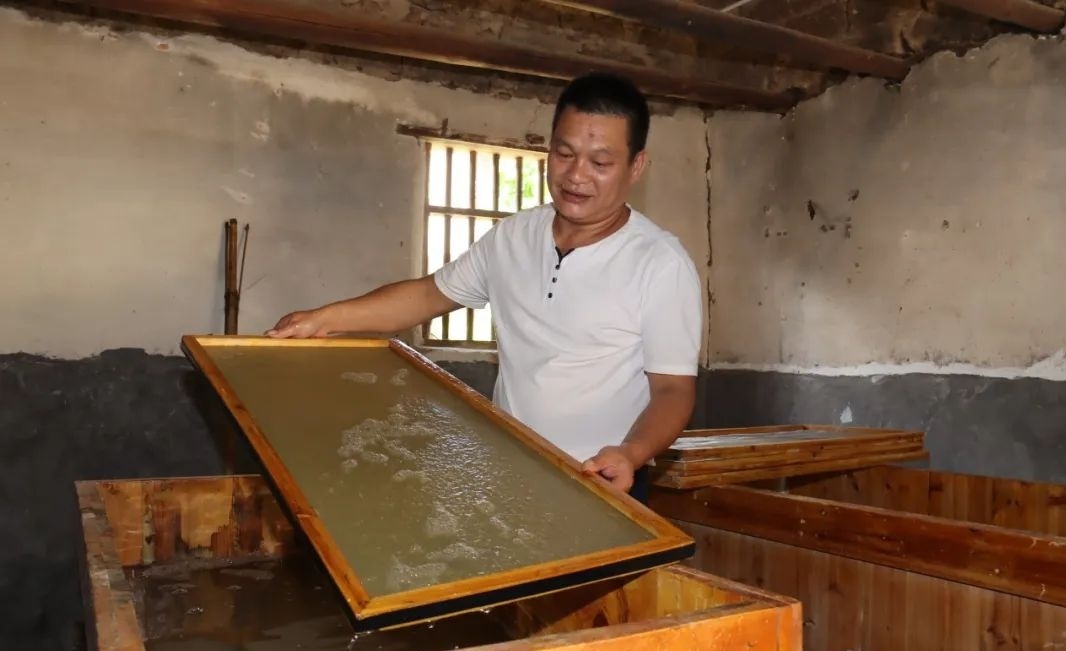 路国忠边说边带领着众人前往自己的造纸小作坊,这里还是村里最传统的红砖瓦房。路国忠说,造纸是一个苦力活,从原料到成品,要历经选材、削青、浸竹、制浆、抄造、干燥等工序,需要耗时大半年的时间,其中的艰辛,估计只有造纸人才能体会。“曾经,这里家家户户都造纸。如今,造纸产业在这里基本上见不到了,但是造纸的技艺手法仍然延续到了今天。”路国忠说。