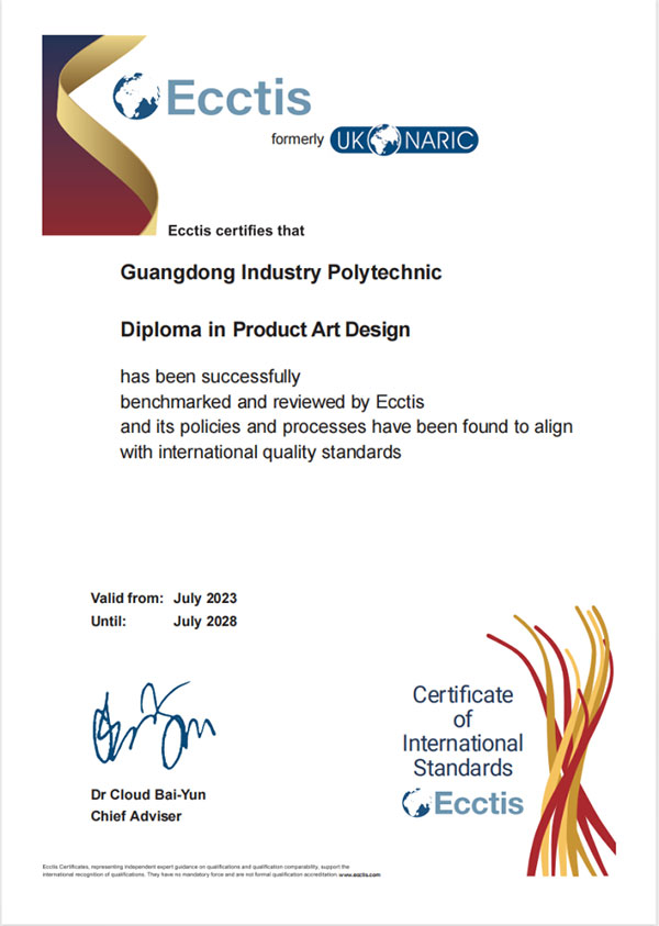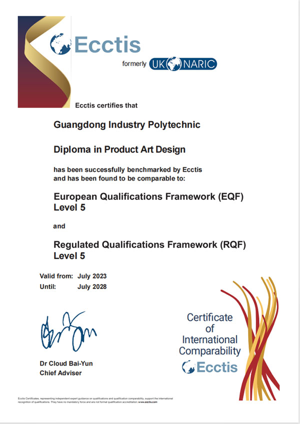 9月2日,在英国国家学历学位评估中心主办的“中英职业教育高质量发展大会”上,广东轻工职业技术学院产品艺术设计专业获得了UK ENIC(英国国家学历学位评估认证中心)国际专业标准评估认证证书,正式通过国际专业标准评估认证,达到了英国资历框架(RQF)和欧洲资历框架(EQF)5级水平(高职教育国际认可的最高级别)。同时,学校的政策与程序符合国际质量标准,顺利取得国际可比性证书与国际质量标准证书,成为我国高职艺术设计类专业首个获得UK ENIC国际评估认证的专业。学校也获得了2023国际专业标准开发领域学术卓越奖。