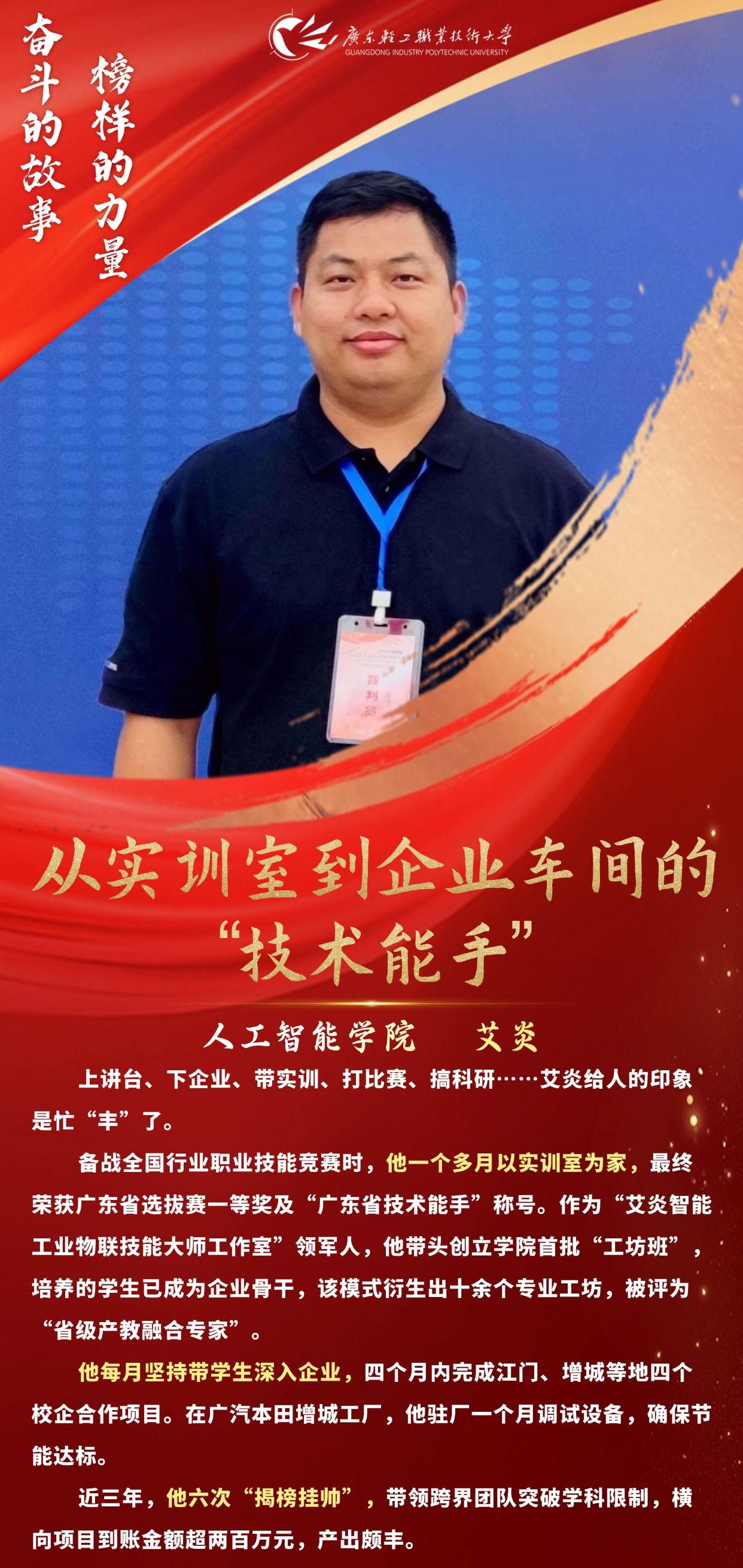 备战全国行业职业技能竞赛时,他一个多月以实训室为家,最终荣获广东省选拔赛一等奖及“广东省技术能手”称号。作为“艾炎智能工业物联技能大师工作室”领军人,他带头创立学院首批“工坊班”,培养的学生已成为企业骨干,该模式衍生出十余个专业工坊,被评为“省级产教融合专家”。