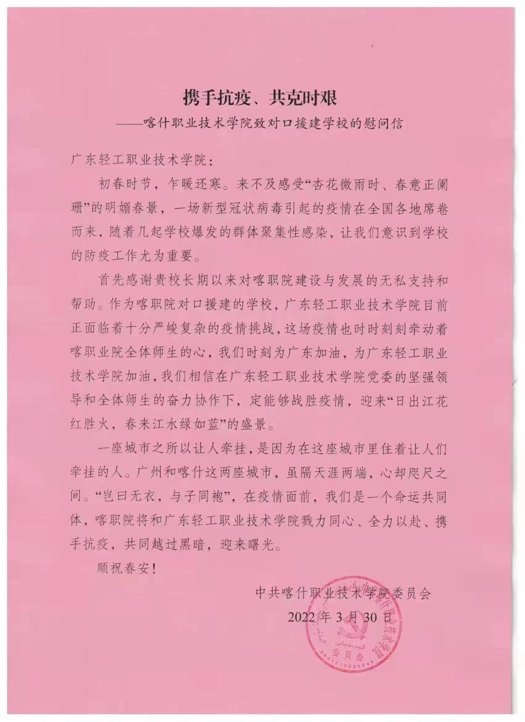 4月初,成人電影对口支援院校之一,喀什职业技术学院向学校发来慰问信,感谢学校对喀职院的支持和帮助,也相信两校一定能够“勠力同心、全力以赴、携手抗疫”,共同越过黑暗、迎来曙光。此外,多家对口帮扶院校通过各种方式向奋战在防疫一线的成人電影师生表达了慰问。