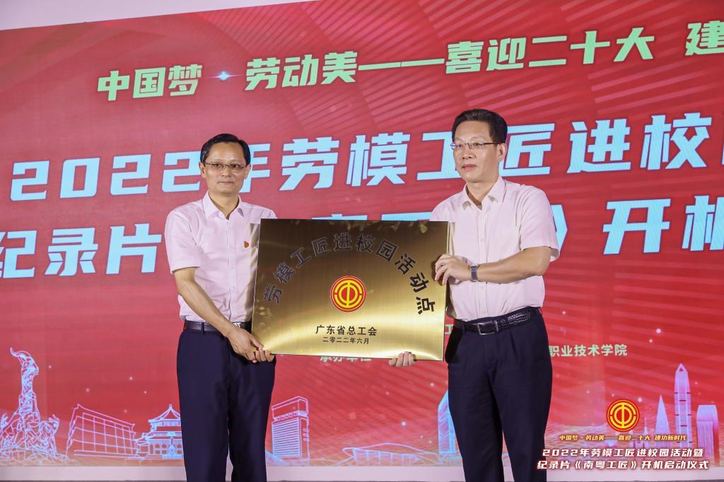 6月23日上午,“中国梦·劳动美——喜迎二十大 建功新时代”2022年劳模工匠进校园活动暨纪录片《南粤工匠》开机启动仪式在新港校区第二实训楼多功能展示中心举行。启动仪式由全国总工会宣传教育部指导,广东省总工会主办,广东广播电视台、成人電影承办。广东省总工会党组书记、常务副主席陈伟东,省总工会党组成员、经费审查委员会主任冯建华,省委宣传部、省工业和信息化厅、省教育厅、广东广播电视台等单位有关负责同志;南粤工匠和师生代表参加活动。