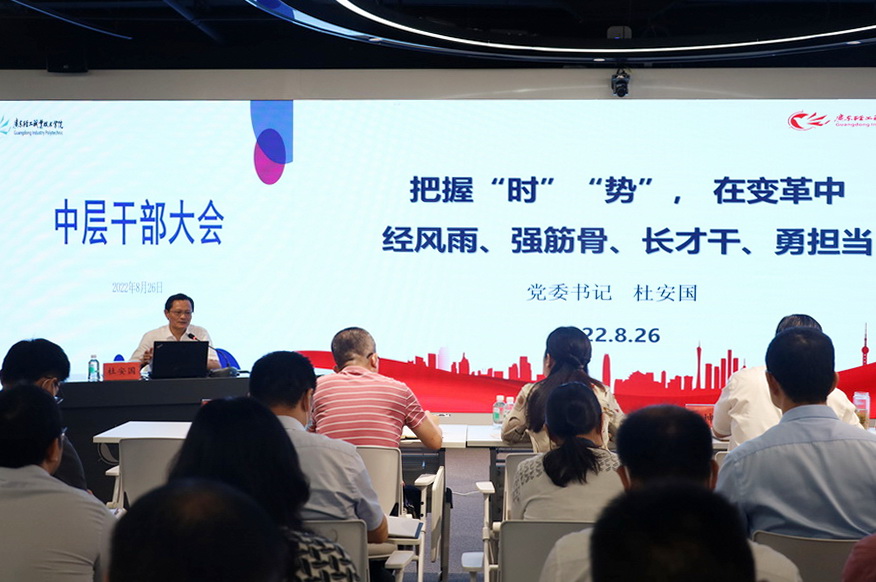 随后,杜安国以《把握“时”“势”,在变革中经风雨、强筋骨、长才干、勇担当》为题,指出新时代职业教育面临的新挑战,剖析经济下行压力下职业院校竞争的新局面,提出职业教育“长优势补短板强弱项”的新路径。今年8月世界职业技术教育大会上,教育部部长怀进鹏在主旨演讲中提出,“整体提升职业院校办学能级,加强职业教育内涵建设和数字化转型”。杜安国表示,新一轮科技革命和产业变革突飞猛进,新冠疫情对全球经济带来深度影响,世界正在经历产业结构、经济结构、人口结构等的深刻调整。面对国内外复杂多变的形势和“能级”提升的发展要求,学校各级党组织、领导干部要统一思想,加强理论学习,提升政治素养,看时代、看形势、看自己,面对眼下的艰巨发展任务,真抓实干,凝心聚力,紧紧围绕学校“双高”大局和“申本”全局,增强工作责任感,以时不待我的紧迫感、主动作为的使命感撸起袖子加油干,以实际行动迎接党的二十大胜利召开。