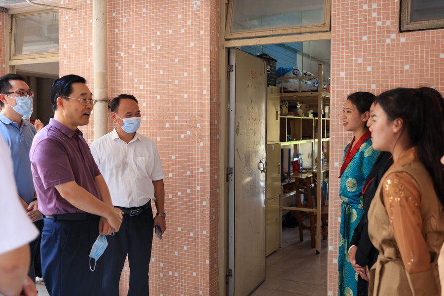 卢坤建在新港校区与藏族新生拉起家常,一一询问大家来校的适应情况和入学感受,并查看了学生宿舍的设施和生活服务保障情况。卢坤建勉励新生们要珍惜在校时光,努力实现梦想,度过健康、充实且愉快的大学生活。