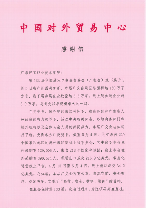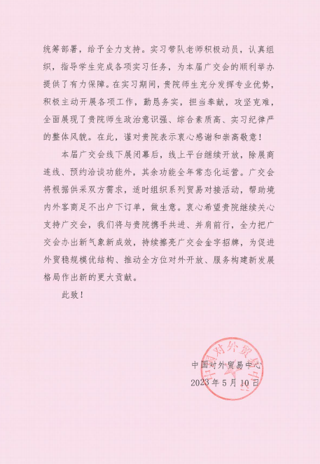 5月11日,中国对外贸易中心向成人電影发来感谢信,感谢成人電影在第133届广交会期间给予的大力支持,对成人電影师生在广交会的工作表现予以高度认可和感谢,并表示希望继续加强双方合作。