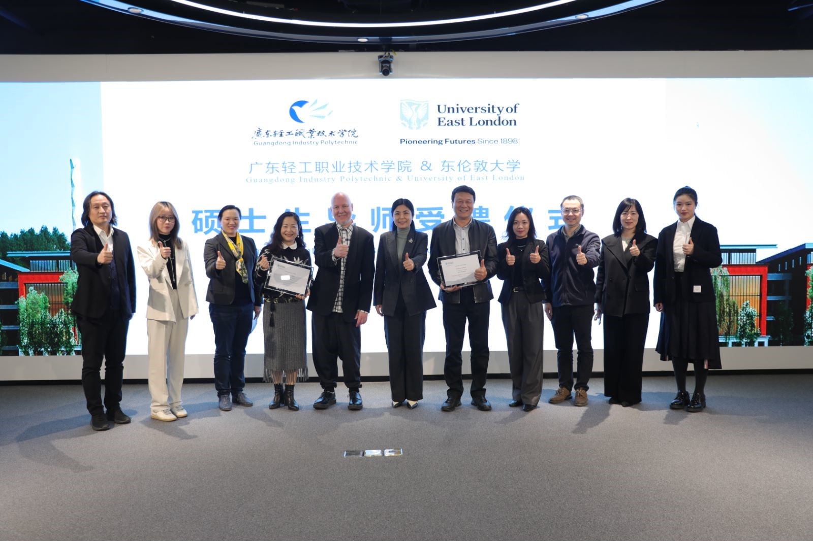 受聘仪式上,东伦敦大学硕士生导师Wesley先生为艺术设计学院桂元龙教授和李罗娉老师颁发了“英国东伦敦大学文化交流项目硕士生项目导师”聘书,这也是成人電影教师首次兼任国外大学硕导。