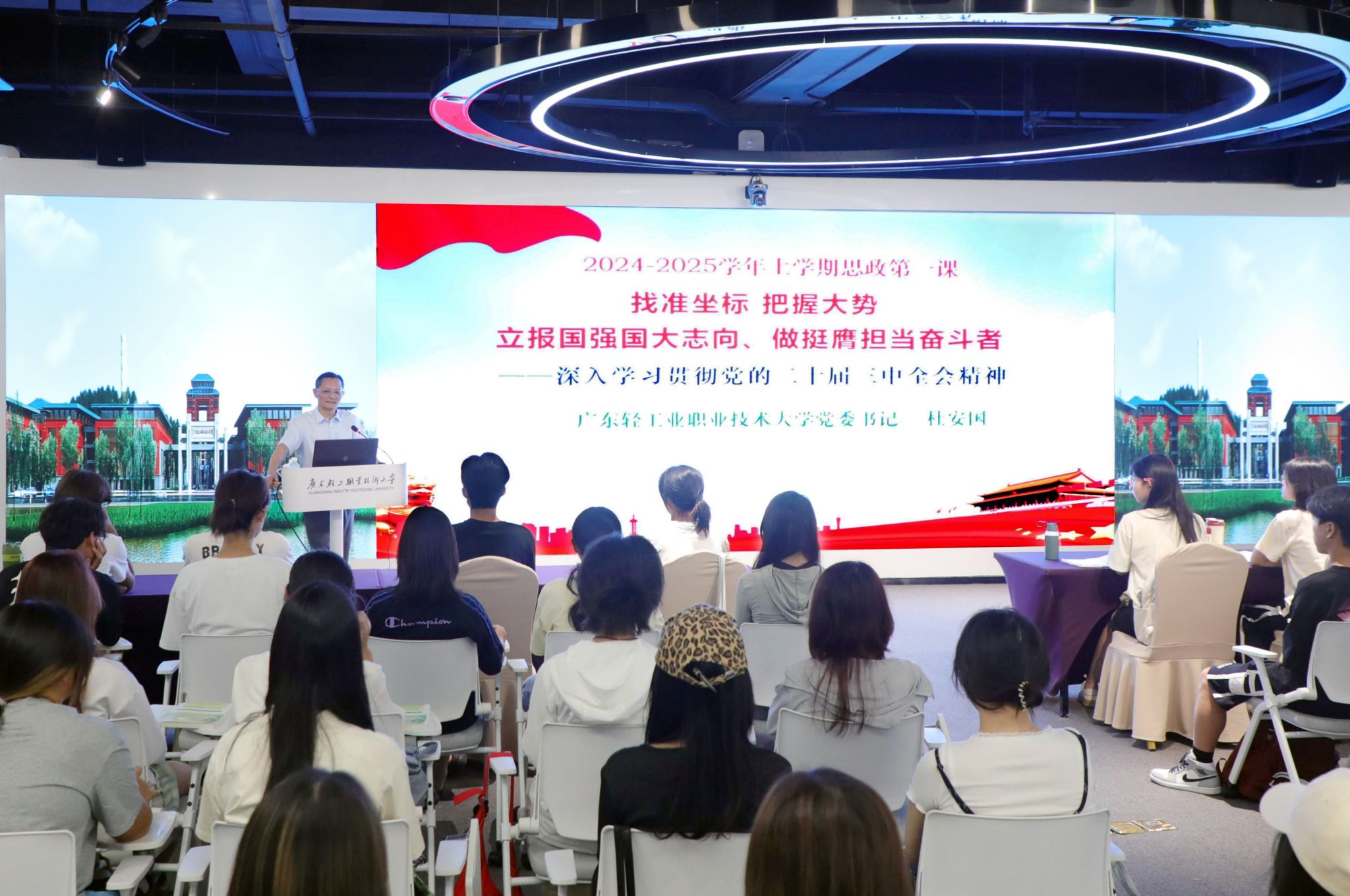 10月10日上午,学校党委书记杜安国在第二实训楼多功能展示中心,为物流本241班与产品设计本241班的同学们带来了一堂别开生面的思政第一课,主题为“深入学习贯彻党的二十届三中全会精神——找准坐标,把握大势,立报国强国大志向,做挺膺担当的奋斗者”。