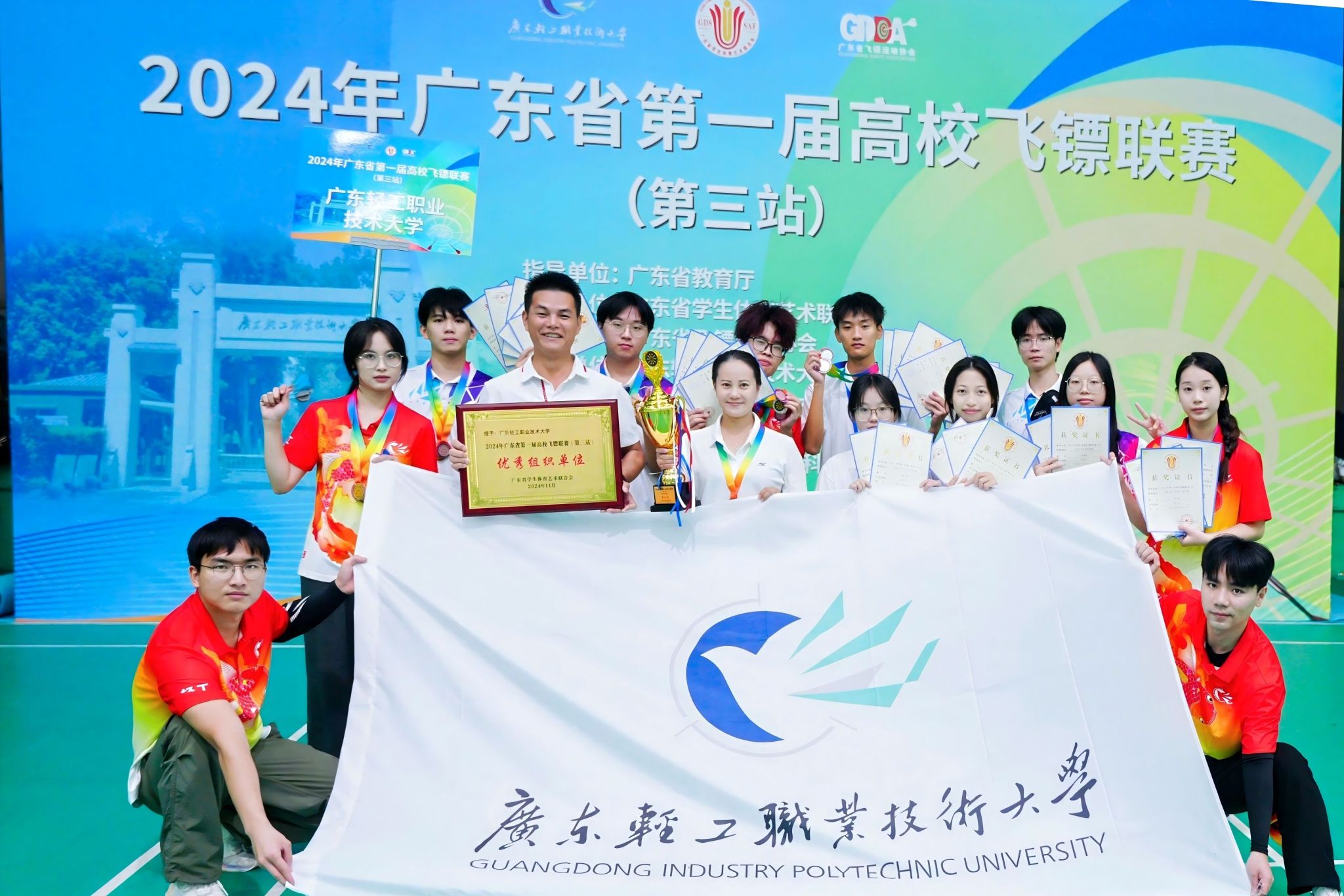 11月8日至10日,2024年广东省第一届高校飞镖联赛第三站在成人電影隆重举行。此次比赛吸引了近200名运动员参与,成人電影派出12名队员参赛,由体育工作部副主任陈绿波担任领队,校飞镖队获得2金4银5铜和团体总分第二名。学校获“优秀组织单位” 称号,陈丽霞、钟林冲老师获 “优秀教练员” 称号。