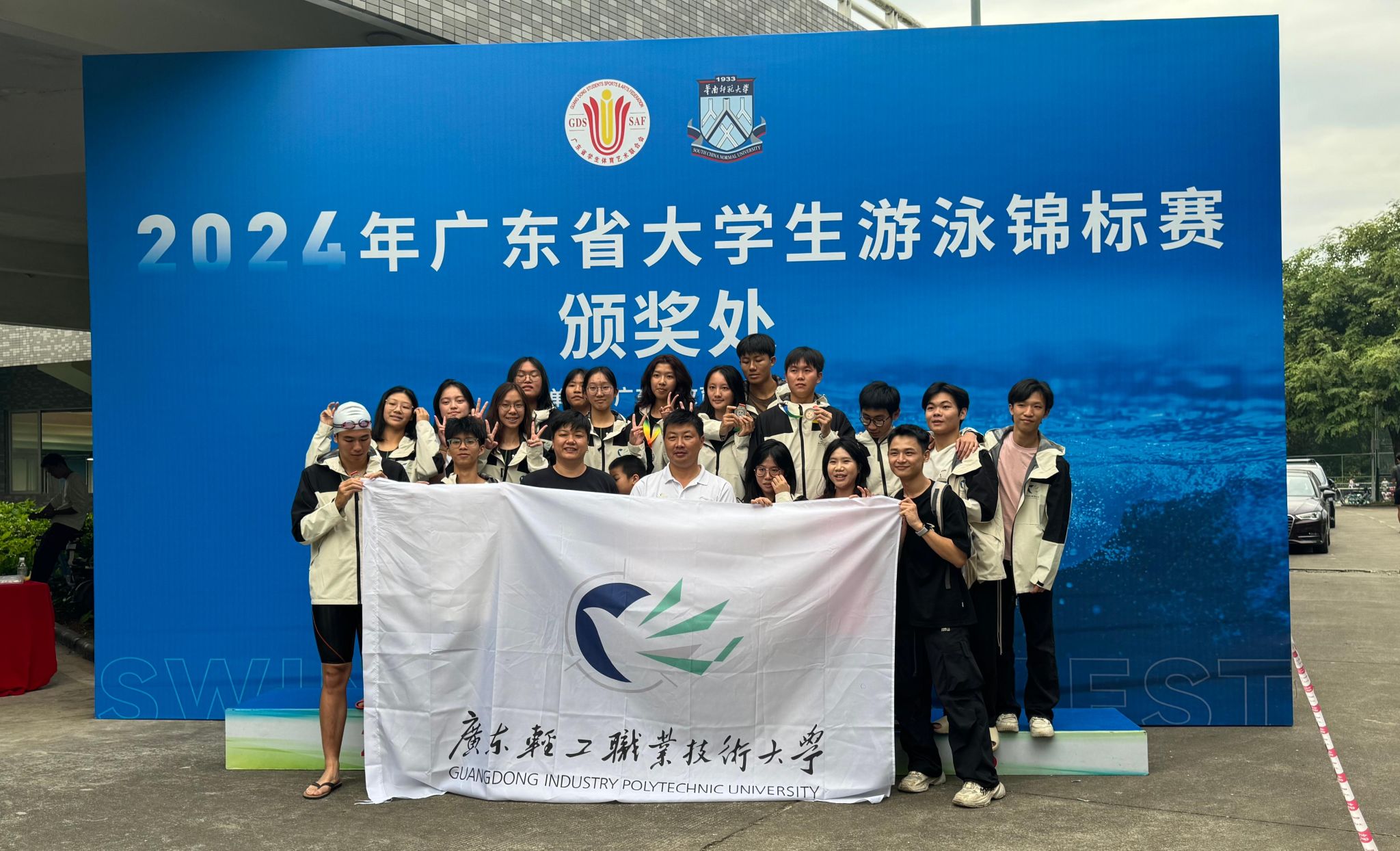 在游泳锦标赛中,成人電影游泳队选派16名运动员,荣获1银2铜及团体总分一等奖。其中,梁倩欣(生化242)、李萍萍(生化231)、李倩怡(化技242)、罗嘉玲(环工241)获得女子4×50米混合泳接力第二名;韩琛妍(声光园林232)、冯杞莹(环工241)、郑彤(化技244)、陈捷霖(食安243)获女子4×50 米自由泳接力第三名;颜楚航(新能源246)、冯仕弘(食检242)、刘科良(环工242)、黄晓滨(机制221)获男子4×50 米自由泳接力第三名,王晓宇、刘俊老师均获 “优秀教练员” 称号。