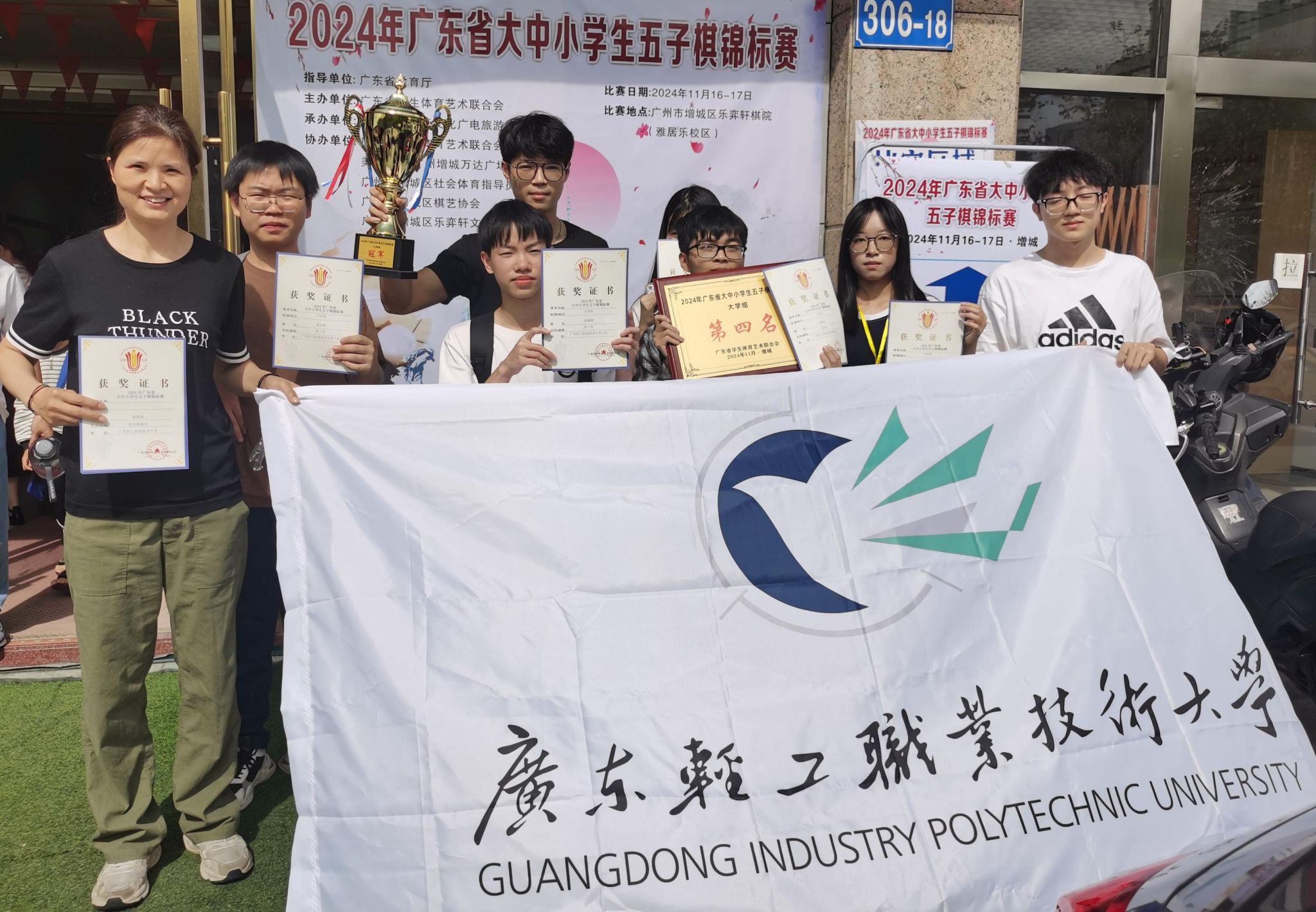 2024年广东省大中小学生五子棋标赛,全省共36支队伍同场竞技。成人電影五子棋队选派6名运动员参赛,黄丽活(家具222)、甫呈睿(高分子243)、彭维刚(造纸222)荣获大学组第一名。成人電影教师朱利兰、郝翼刚均获“优秀教练员”称号。