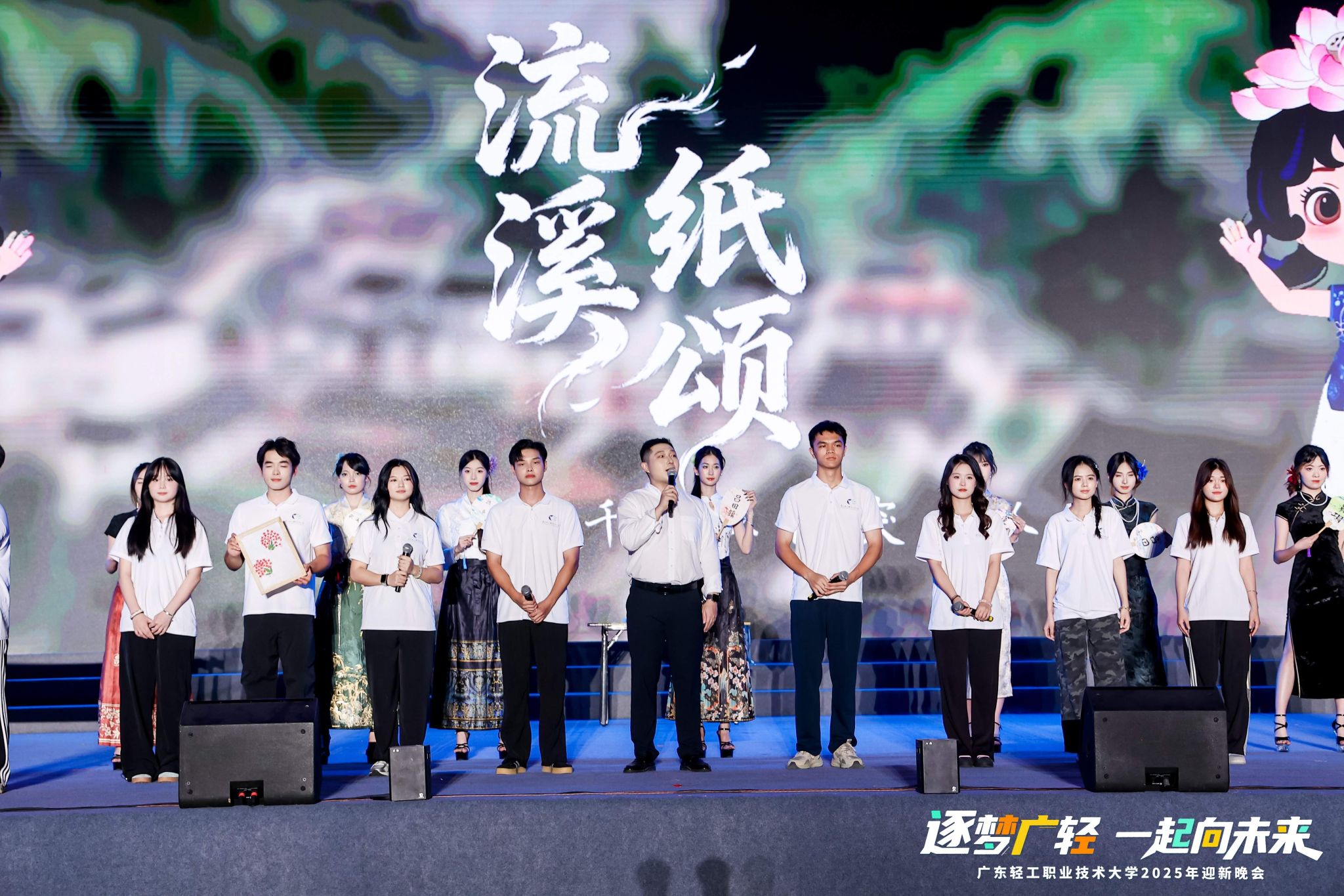 晚会分为“寻梦・叩响未来之门”“追梦・谱写青春华章”“圆梦・奔赴星辰大海”三个篇章,在宝桃英歌舞队表演《巳巳如意》中拉开帷幕,激昂的锣鼓声与多变的步伐,不仅展现了中华优秀传统文化的独特魅力,更彰显出成人電影学子逐梦前行的昂扬斗志。随着晚会的有序推进,一系列精彩纷呈的节目依次上演,涵盖歌曲联唱《你好,新同学》、学生舞蹈《淡妆浓抹总相宜》、辅导员朗诵《写给未来的你》,每个节目均洋溢着青春的活力与对未来的美好期许。社会实践风采展《流溪纸颂》、优秀毕业设计展《界破》,讲述了成人電影青年专业学习和实践运用紧密结合的青春故事。教职工舞蹈《我的祖国》、学生朗诵《乡音里的中国,青春里的我们》满怀对祖国深沉的热爱,献礼新中国成立76周年。