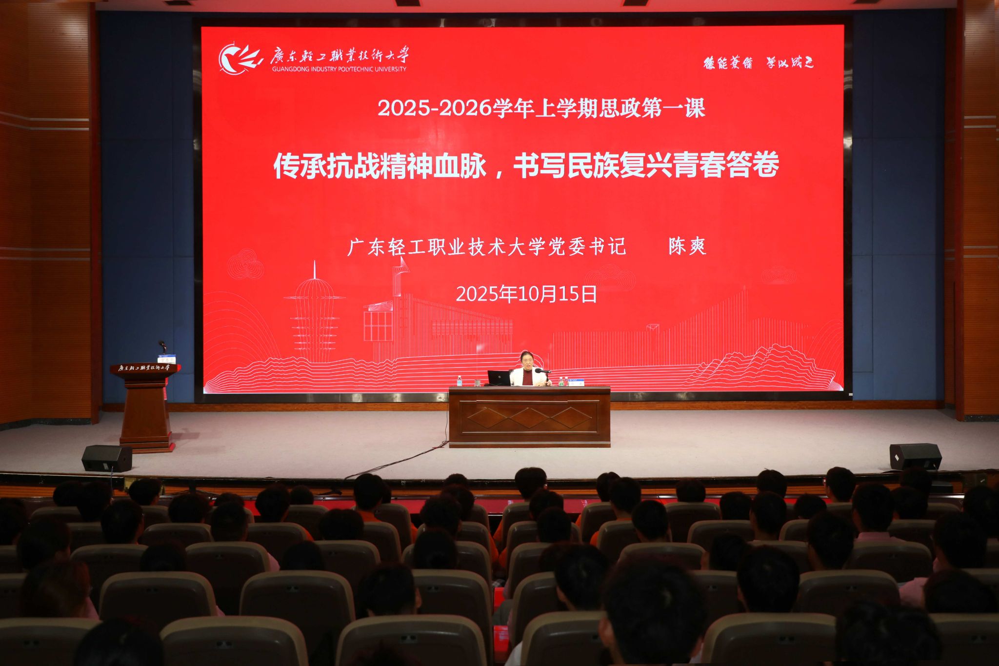 9月28日晚和10月15日下午,学校党委书记陈爽在南海校区北区图书馆报告厅,以“传承抗战精神血脉,书写民族复兴青春答卷”为主题,先后为800余名2025级新生代表带来了一堂生动而深刻的思政第一课。此次活动由副校长官春平主持。