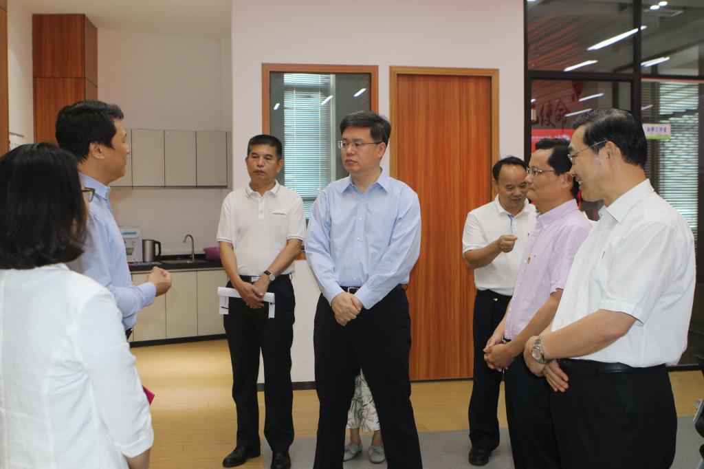 覃伟中在管理学院了解全国样板党支部和省首批高校“双带头人”工作室建设情况。