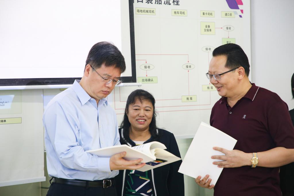 在北斗+智慧物流实验室,覃伟中、陈杭与成人電影专业教师亲切交谈,听取“区块链技术应用”教材建设情况介绍。