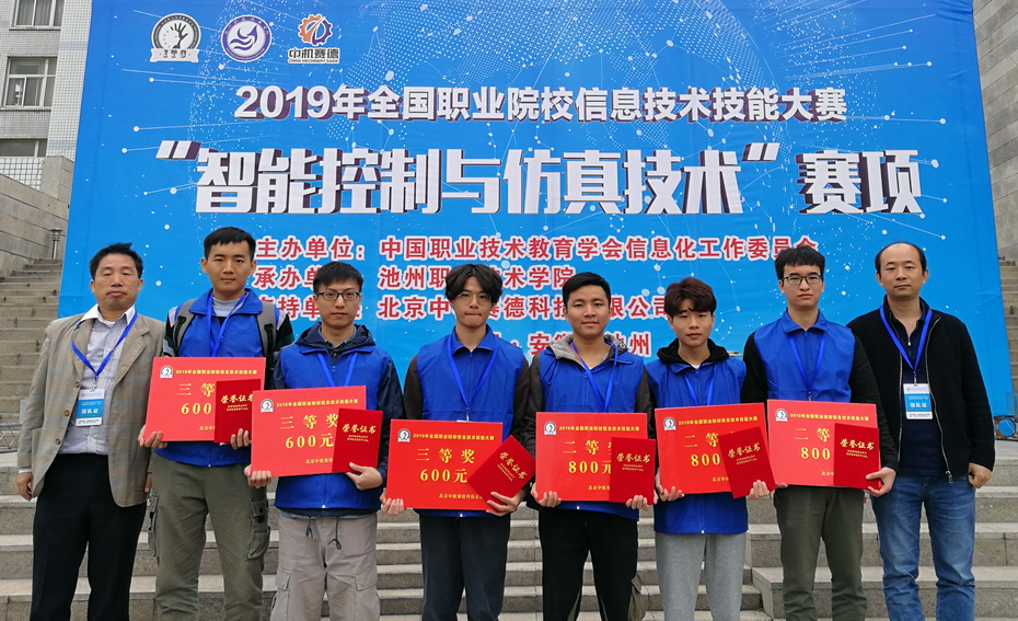 102527日, 2019年全国职业院校信息技术技能大赛-智能控制与仿真技术赛项在安徽举行。经过紧张激烈的角逐,成人電影机电技术学院工业机器人技术专业的郑厚才、黄培豪和黄智汉等同学组成的一队获得二等奖,指导老师是毛诗柱和苑振国,纪俊涛、梁嘉源和巫俊杰等同学组成的二队获得三等奖,指导老师是颜学定和杜亮。