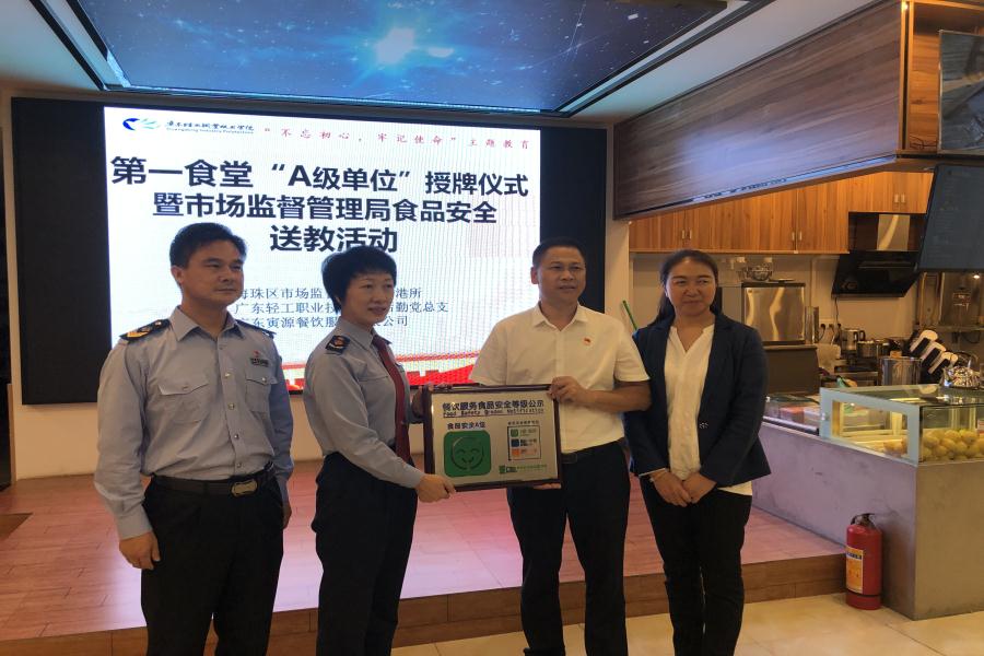 11月5日下午,第一食堂“广东省餐饮服务食品安全等级A级单位”授牌仪式暨市场监督管理局食品安全送教活动在成人電影广州校区第一食堂举行,海珠区市场监督管理局新港所所长黄漫、副所长付国平、学校后勤管理处处长杨华江、广东寅源餐饮服务有限公司总经理危晓玲、后勤管理处及企业相关人员出席该活动。授牌仪式后,市场监督管理局专家现场开展送教活动,向现场师生员工讲解学校食堂食品安全知识,科普国家最新法规政策,并与现场学生互动沟通高校食堂存在的问题、解决办法和党建融合工作,让师生进一步了解学校食堂食品安全知识和食堂党建工作。