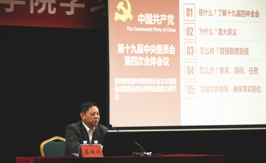 葛国兴从“是什么,了解十九届四中全会”“为什么,重大意义”“怎么样,增强制度自信”“怎么办,要求、目标、任务”“加强党的领导,确保落实到位”等五个方面对党的十九届四中全会精神进行了全面解读。
