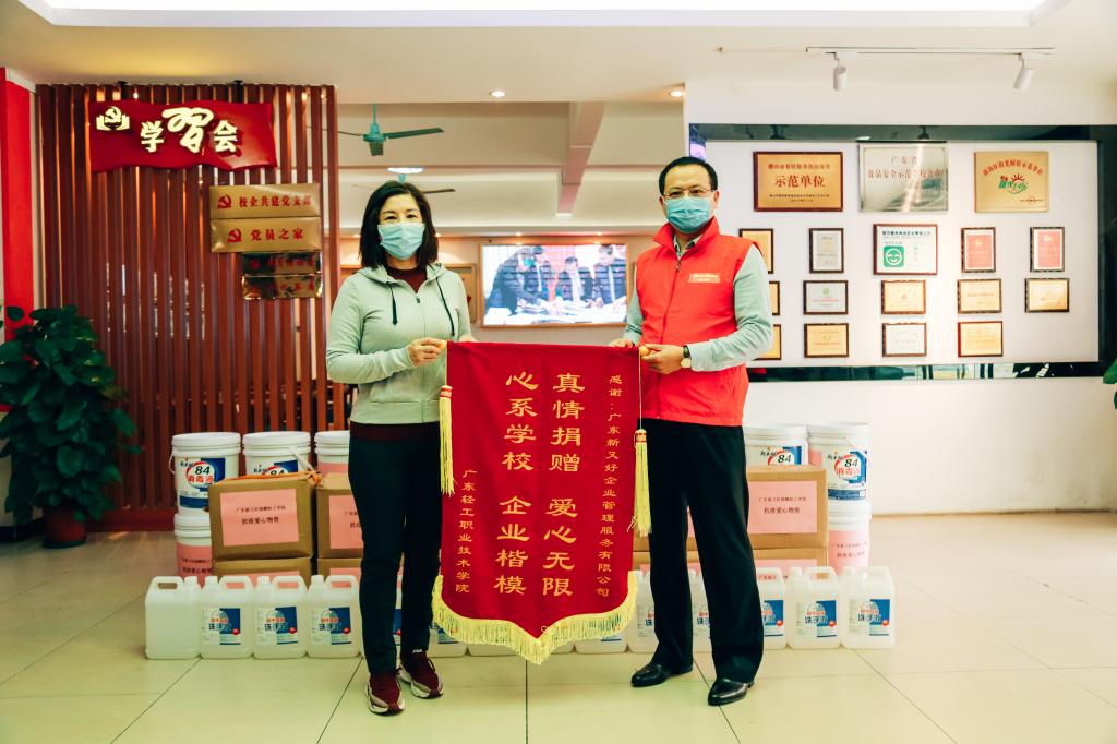 病毒无情,人间有爱。杨奇伟总经理表示,作为服务学校的餐饮企业和校企共建党支部,在做好学校饮食保障工作的同时,也将尽一份社会企业的力量,积极支援学校一线防控工作,共同守护健康校园。李丽副校长代表学校对广东新又好企业管理服务有限公司的爱心捐赠和帮助表示衷心感谢,对该企业积极担当社会责任的做法表示赞赏,希望继续发挥校企合作优势,打好疫情防控阻击战。