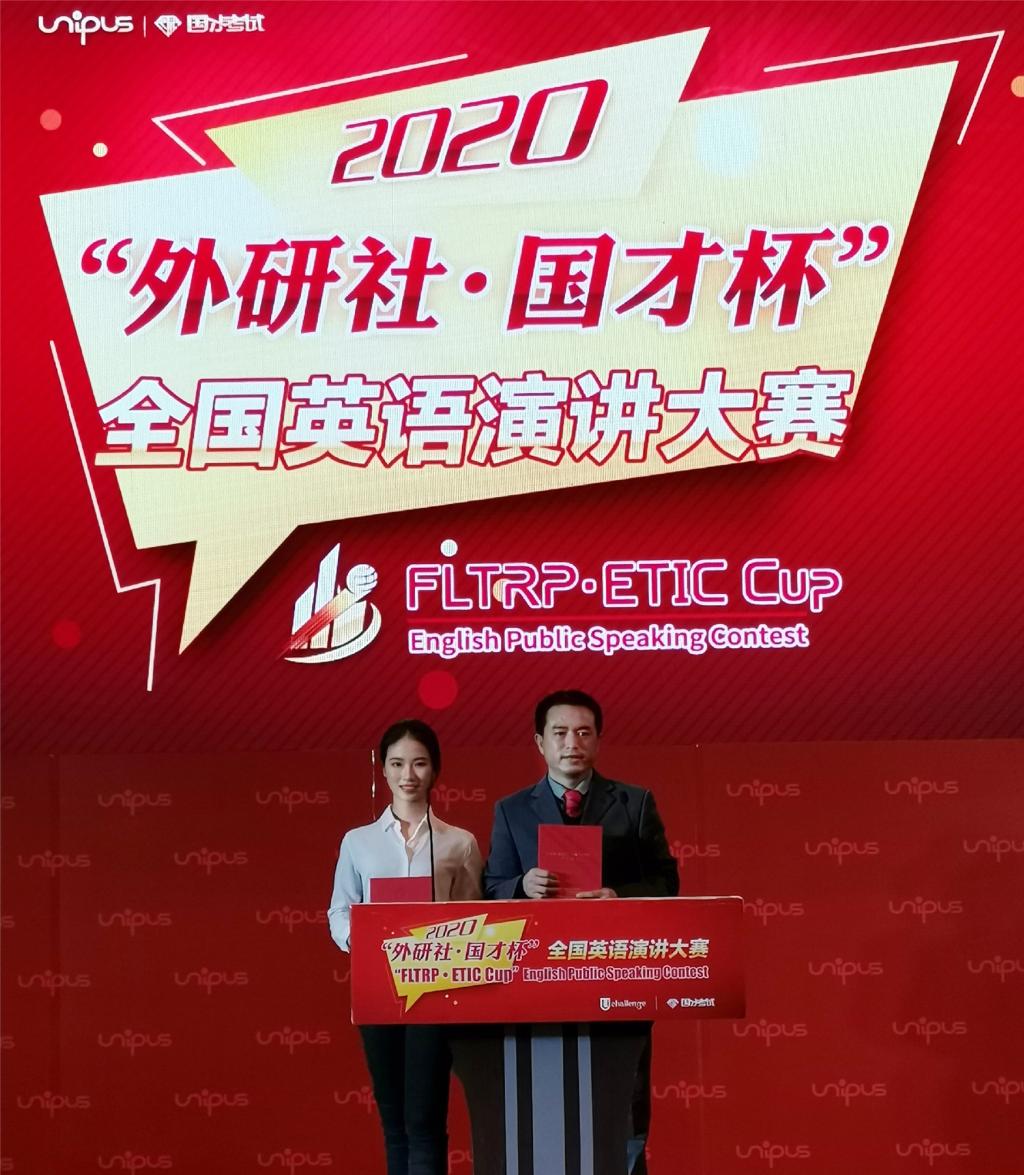 由外语教学与研究出版社主办的2020年“外研社·国才杯”大学生英语演讲大赛(高职高专组)全国总决赛 12月20日在北京顺利举行。由成人電影应用外语学院舒立志老师指导的物流181班冯一琛作为公英选手,在与英语专业选手的比赛中,表现优异,最终在全国35名选手中排名第九,荣获二等奖。