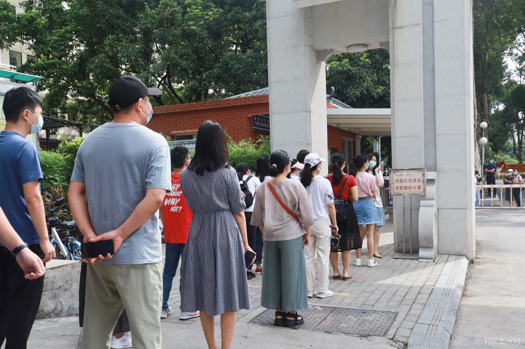 演练开始,准备入校的“同学”们按要求排好队,佩戴好口罩,有秩序地通过人脸识别门禁,门卫工作人员对其进行测温,并检查粤康码。绿码、体温正常、无其他症状者,方可进入校内。