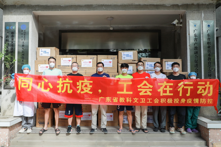 11月21日上午,省总工会、省教科文卫工会开展“同心抗疫 工会在行动——广东省教科文卫工会积极投身疫情防控”行动,积极发动、携手爱心企业,按照学校列出的需求物资清单,紧急筹集50000余份抗原检测试剂、5000余件防护服等,共捐赠成人電影价值60余万元抗疫物资。