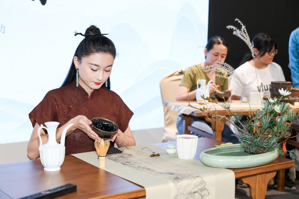 黄建红在活动中现场传授了宋代点茶技艺,详细介绍了它在中国茶文化中的重要地位。参与者还有机会近距离观赏宋代点茶器具,并与黄建红互动“斗茶”,通过实践学习感受中华传统茶道之美。(学生工作部、管理学院)