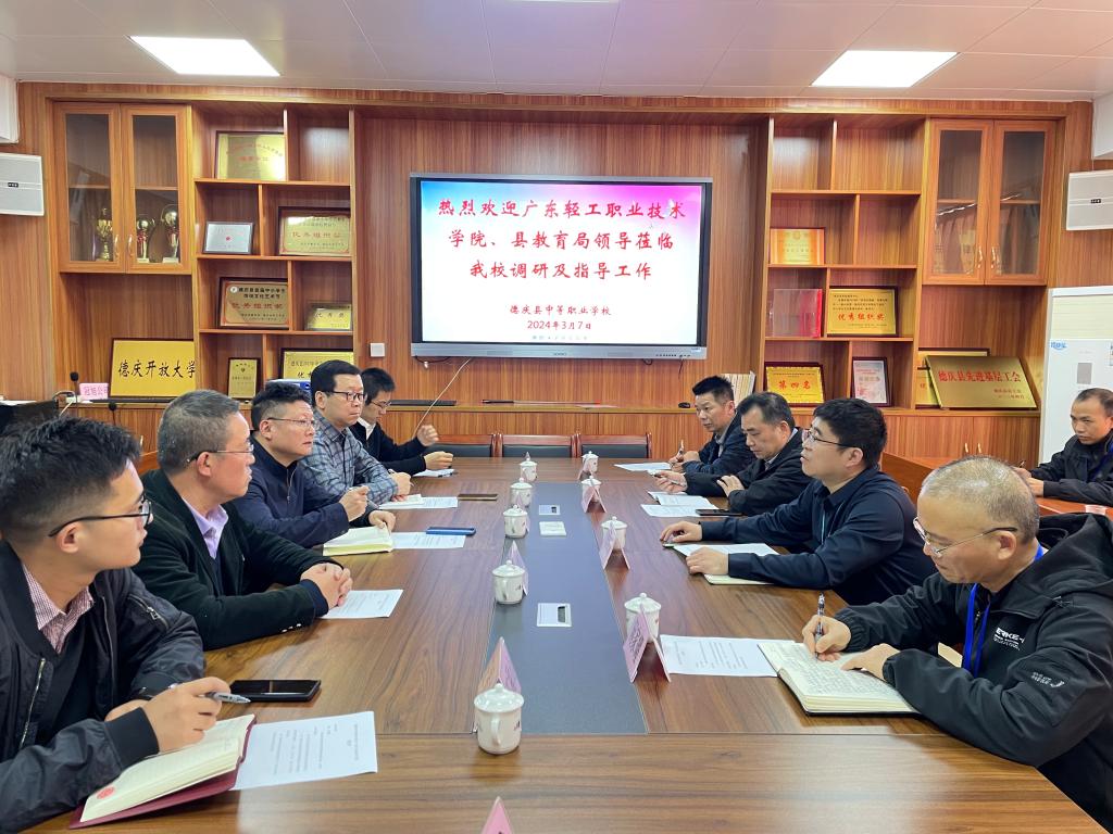 郝翼刚、教务部揭广川和汽车技术学院张艳来、王福山,信息技术学院王康到德庆中等职业技术学校开展专题调研,围绕学校招生宣传、三二分段人才培养、专业设置、师资培训等问题提出相关意见。县教育局聂创标股长,中职苏秀锋校长陪同。