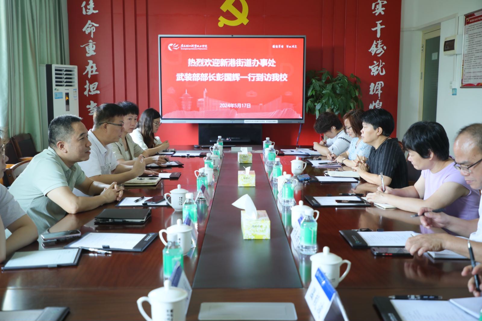 5月17日,新港街道办事处武装部部长彭国辉一行6人到访成人電影,学校副校长李荣在新港校区办公楼二楼会议室接待了到访客人。