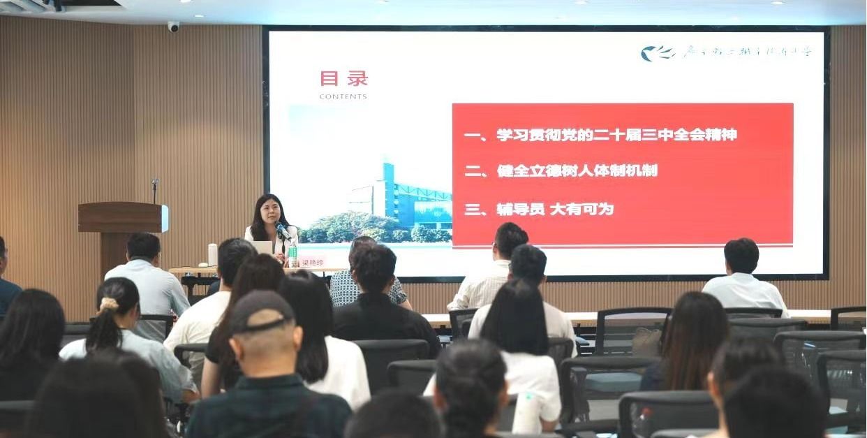 会上,梁艳珍以《学习贯彻党的二十届三中全会精神,培养德智体美劳全面发展的社会主义建设者和接班人》为主题,深入阐述坚持党的全面领导、坚持以人民为中心、坚持守正创新、坚持以制度建设为主线、坚持全面依法治国、坚持系统观念等“六个坚持”重大原则与职业教育、学生日常工作之间的关系;并结合学校健全立德树人体制机制的实践与工作实际,希望辅导员们以曲建武、陈小花等优秀人物为榜样,以学校职教本科发展为契机,在实现个人价值的同时为学生、学校、教育事业奉献力量。