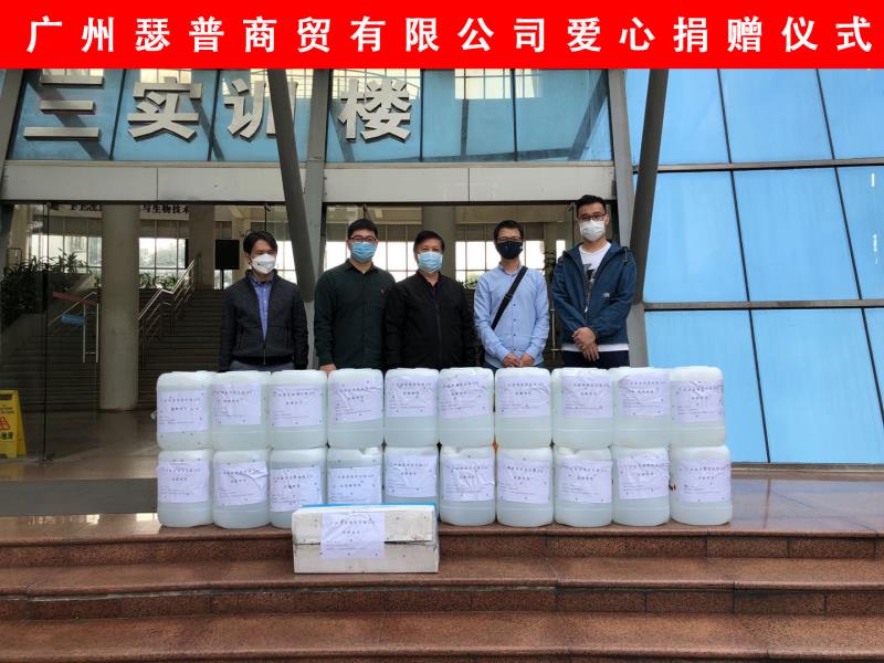 2020年2月28日下午,受广州瑟普商贸有限公司经理曾志玉委托,公司员工黄学军代表公司向成人電影捐赠20桶(共1000斤)75%医用酒精和喷壶1批,学校工会主席陈东华代表学校在南海校区第三工业实训楼前接受捐赠,并对慷慨捐赠、无私奉献的校友和校友企业表示敬意和感谢。校办副主任麦晓冬、学院副书记吴忠坤、教务处郭海库老师参加了捐赠仪式。