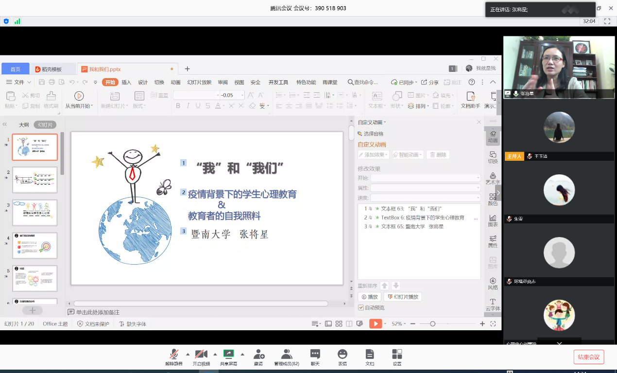 为落实粤高校心【2020】7号文件“关于做好高校复学前后心理危机事件防范工作的通知”要求,4月21日,成人電影学生工作处、大学生心理健康教育与咨询中心特邀暨南大学心理健康教育中心主任张将星教授开展题为“我和我们的互助——疫情背景下学生心理教育与教育者的自我照料”的专题讲座,全体辅导员、学生处全体人员、心理中心全体老师参与本次线上讲座。