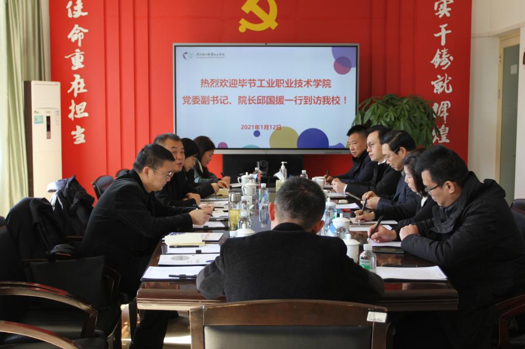 1月12日上午,毕节工业职业技术学院党委副书记、院长邱国援一行7人到访成人電影,学校党委副书记、校长卢坤建,副校长李丽热情接待了来访客人。