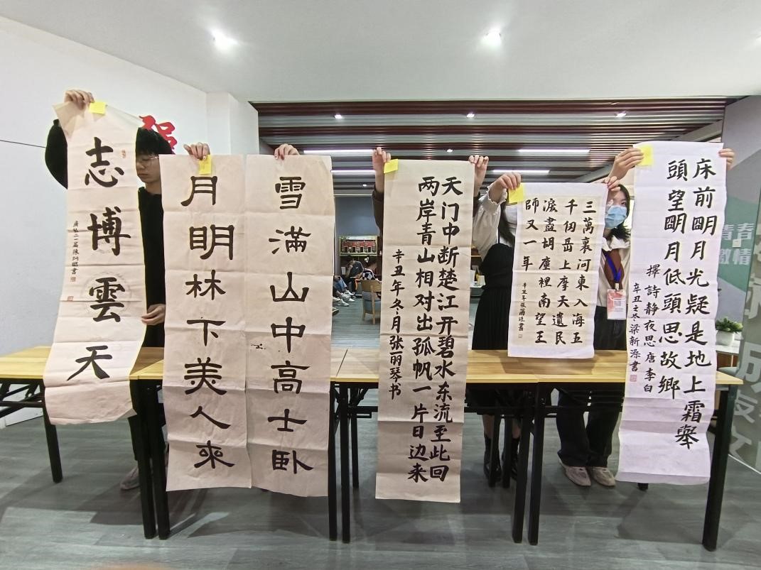 大赛还邀请庞科成、胡敏两位老师为作品点评,从无我到有我的转变,从书法墨法与笔法、字形和章法来鉴赏,从书法作品内涵诠释、布局和宣纸的运用都很关键。通过墨法来辅助章法的空间关系,用“黑”和“白”的对比和衔接,让师生沐浴在笔墨章法的行云流水和谋篇布局的智慧源泉,更加增进坚定中华传统文化的自信。(图/文 食品与生物技术学院 吴毓清)