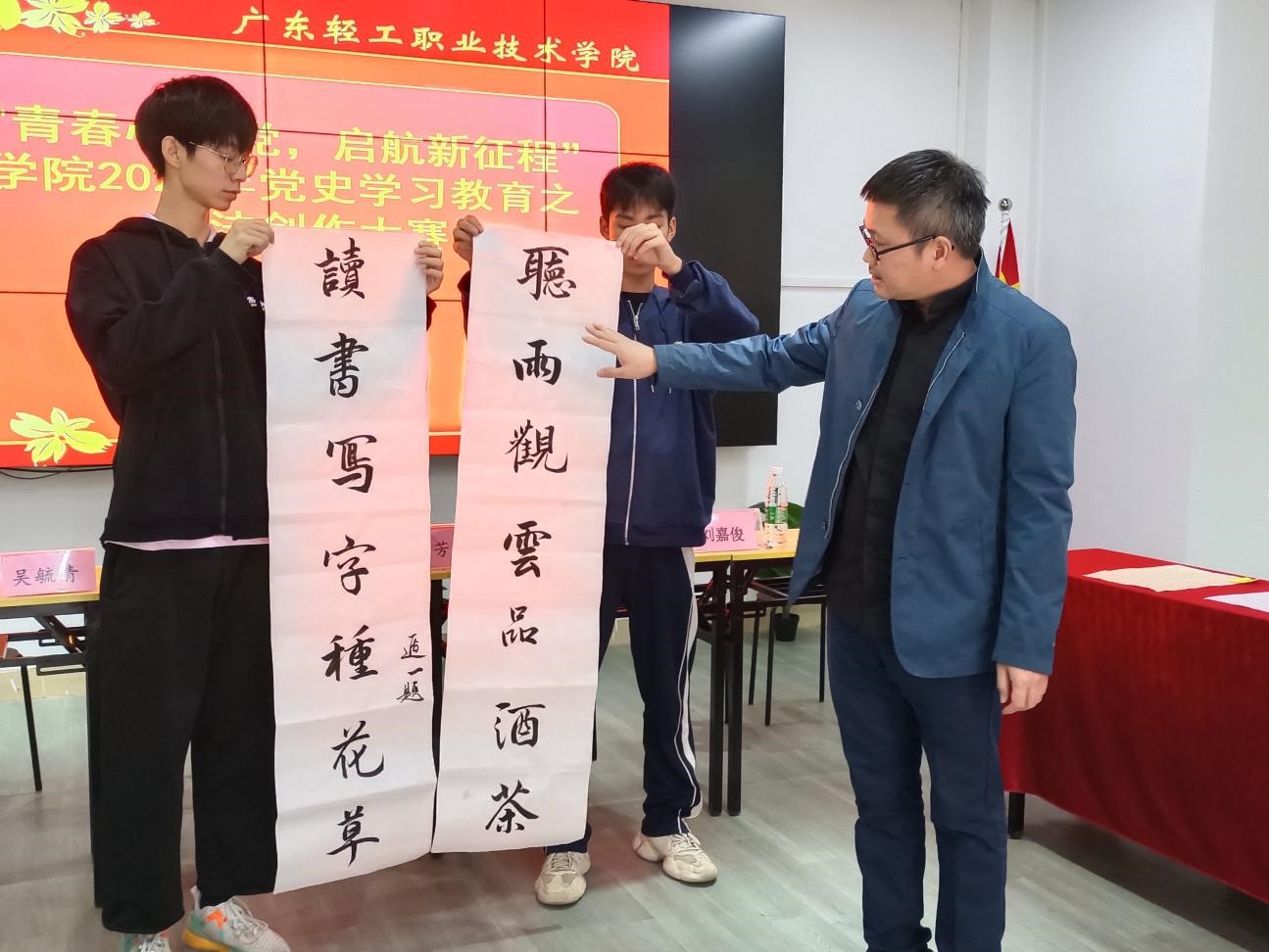 为了深入学习习近平总书记十九届六中全会重要讲话精神,持续推进学校党史学习教育。12月9日上午,由学校党史领导小组主办、食品与生物技术学院党总支承办的“青春心向党、启航新征程”书法创作大赛在成人電影南海校北区党建文化中心举行。食品与生物技术学院党总支书记周爱芳,副书记刘嘉俊、学校成人電影瀚阳书画协会的指导老师庞科成、胡敏参加了开幕式并进行了现场评奖。