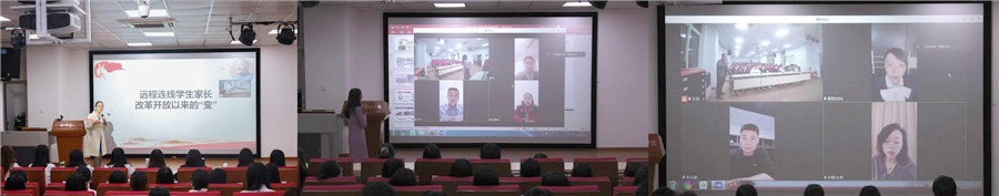 12月15日,在《毛泽东思想和中国特色社会主义理论体系概论》课,余芳老师邀请来自深圳的林海文等多位学生家长通过远程连线进入课堂,以“改革开放以来的变”为主题,与家长们一起从自身、从家乡变化等微视角给同学们讲了一场生动的“改革开放的故事”。
